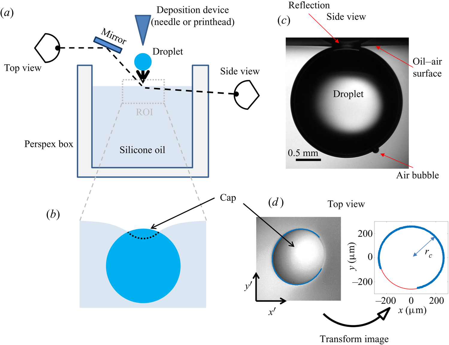Figure 4. (a) Schematic diagram of the experimental set-up. The region of interest (ROI) is indicated. (b) Close-up schematic representation of the ROI during an experiment, showing the cap of the droplet visible above the oil bath surface. Panels (c) and (d) show typical experimental images in side and top views, respectively, during stage 3 of the experiment. Panel (d) shows the results of an image analysis routine which detects the edge of the droplet cap (left image; blue points): the image is distorted by the oblique viewing angle of the top view; a transformation procedure described in § 2.2 reconstructs the axisymmetric perimeter of the cap (right image; blue points), which is well approximated by a circle (red line), so that the radius