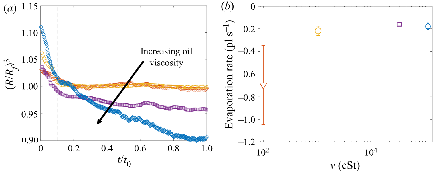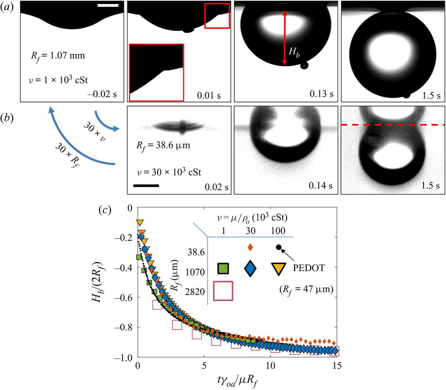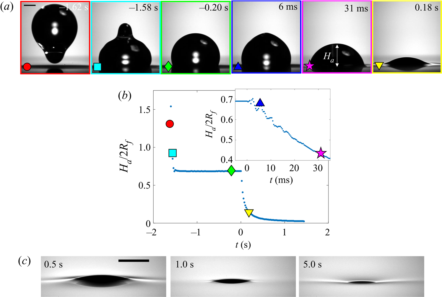 $R_f=1.07$ mm) are shown in figure 16(a,b) (blue stars). For comparison, we have plotted data for the same size drops on 1000 cSt PDMS oil on the same axes. For both of the drops on PPMS oil (