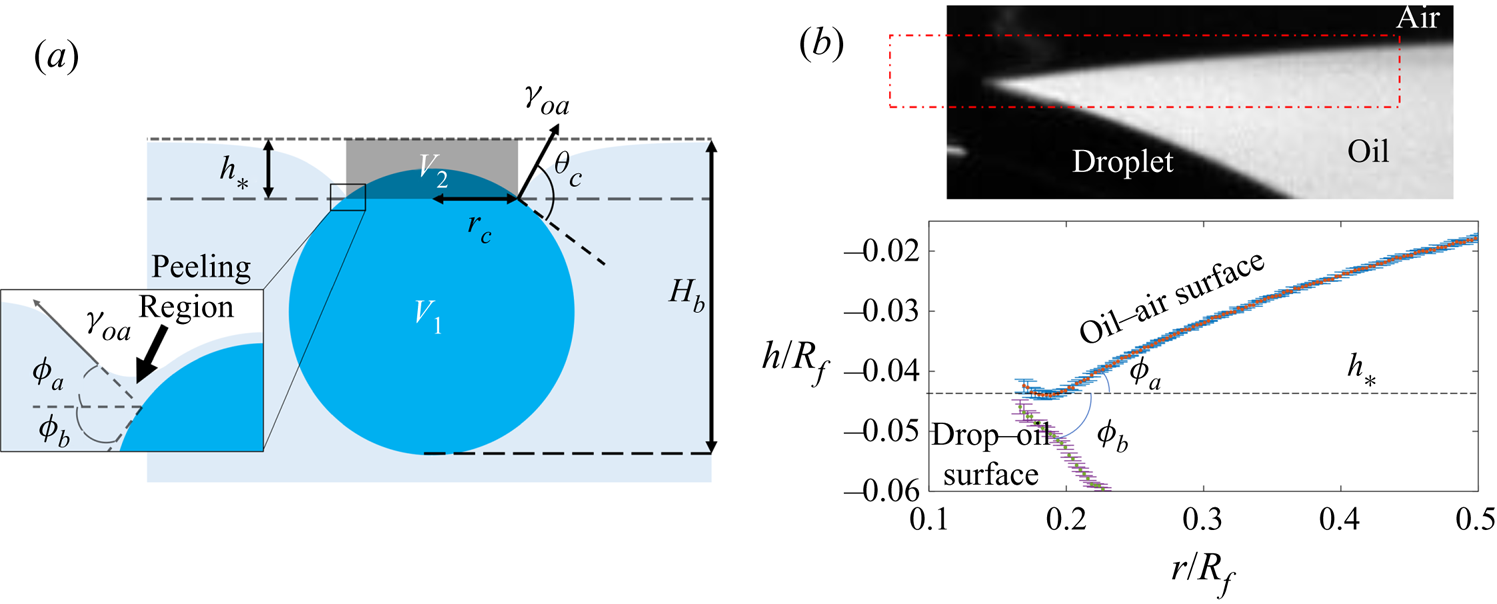 $R_f$ is the droplet's in-flight radius. (b) Illustration of the dynamical process of engulfment, tracking the height