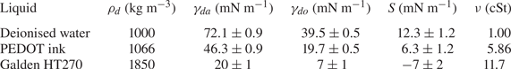 $\gamma _{do}$, were measured for each liquid in table 2 using the pendant drop method (Daerr & Mogne Reference Daerr and Mogne2016). The 1000 cSt PDMS oil was used for measurements of
