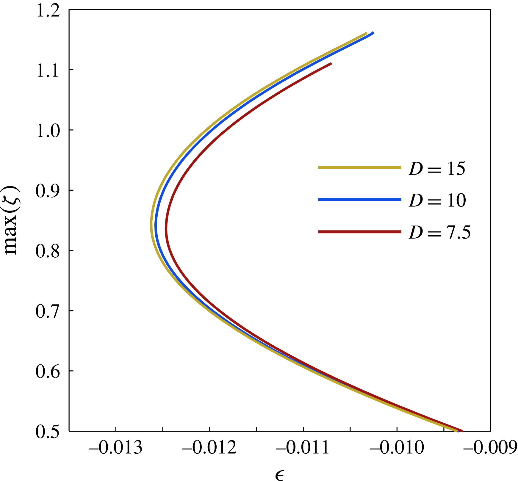 and 15. For clarity we stop the bifurcation curves before the second fold. As the depth increases, the snaking diagrams are shifted to the left and the maximum height of the patches increases as well. It becomes clear that the existence regions of the localised patches are affected by the depth of the fluid. This is believed to be caused by the Neumann boundary conditions at the bottom (which insist that the magnetic field decays to the applied magnetic field here). In a shallow layer, that constraint also reduces the magnetic field within the tip of the spikes, and thus their maximum height.