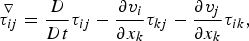 (8) $$\mathop {\tau_{ij}} \limits^\nabla = \displaystyle{D \over {Dt}}\tau _{ij} - \displaystyle{{\partial v_i} \over {\partial x_k}}\tau _{kj} - \displaystyle{{\partial v_j} \over {\partial x_k}}\tau _{ik},$$