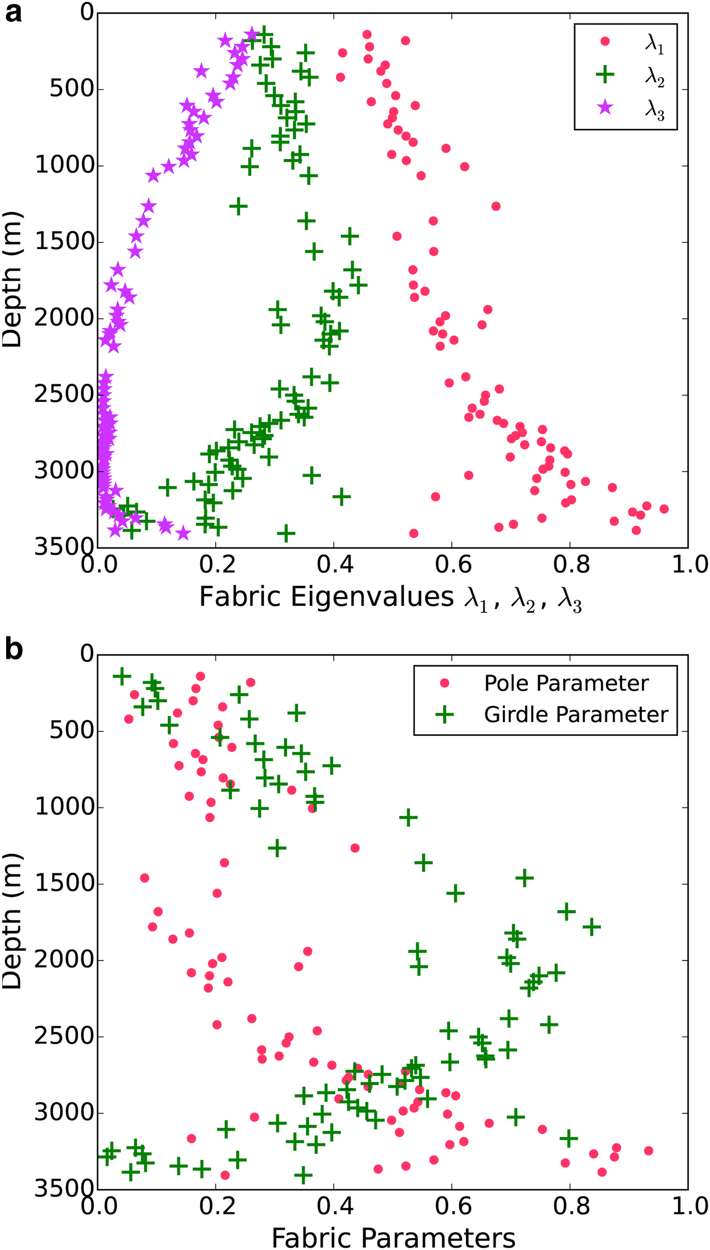 Fabric eigenvalues for all thin-section measurements are shown in Figure 11a. Fabric parameters, as a function of ice depth, are shown in Figure 11b. At the WAIS Divide, fabric gradually develops into strong girdles in the upper 2000 m of ice. Below 2000 m, there is a relatively abrupt shift to vertical-pole fabrics, until the bottom several hundred meters, where the pole parameter varies substantially between measurements and has a lower average magnitude.