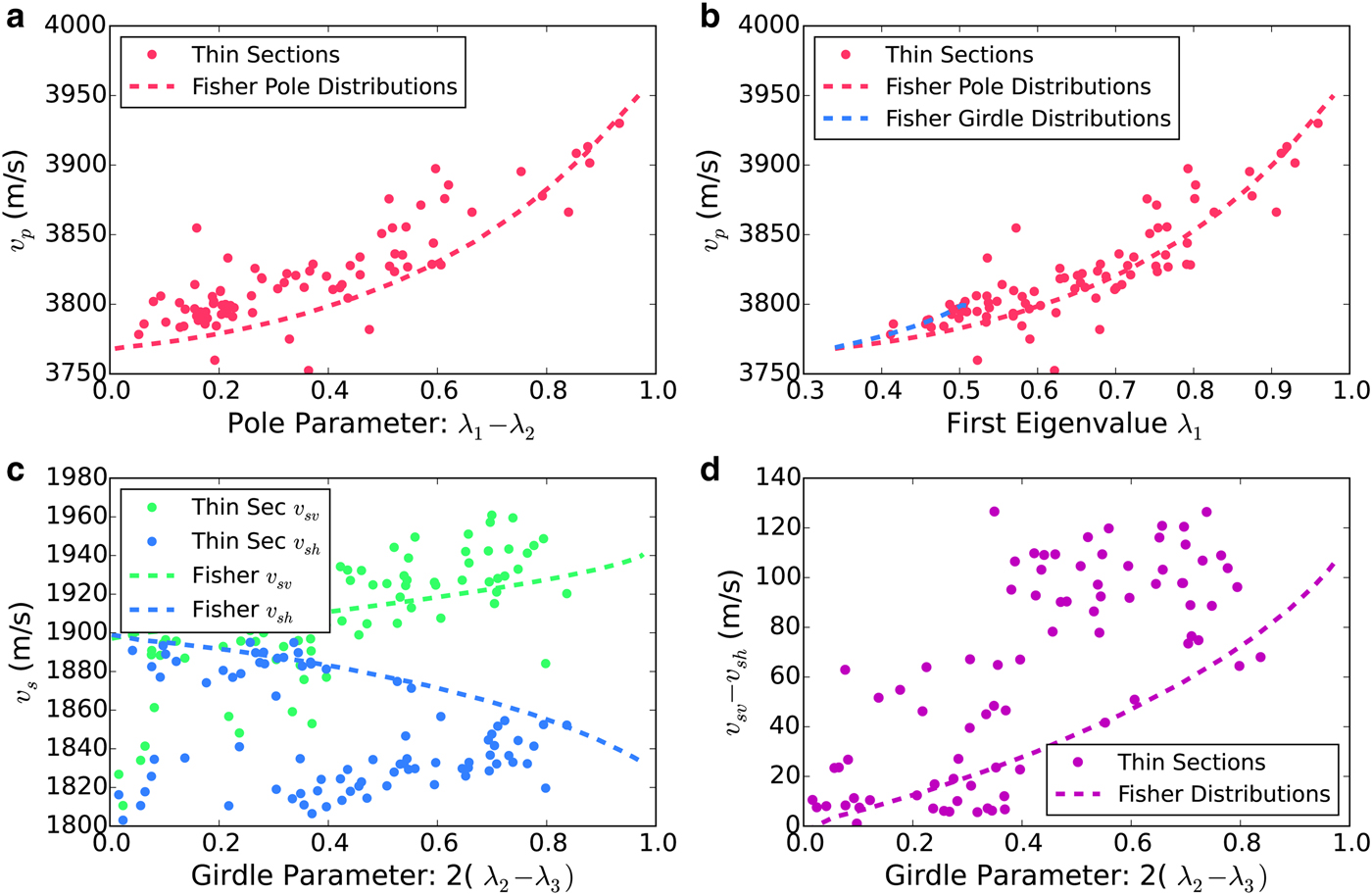 Fig. 12. Comparison of COF features and predicted (using 4 and 7) wave speeds for both measured thin-section fabrics (dots) and for idealized Fisher-distribution (dashed lines) fabrics. (a) shows the relationship between pole parameter λ 1 − λ 2 and P-wave speed v p. (b) shows P-wave speed v p as a function of the largest eigenvalue λ 1. This relationship is also shown for the Fisher girdle distributions, although their range on the λ 1 axis is narrow. (c) shows how the speeds of fast- and slow-polarized shear waves are affected by girdle development for observed fabrics and synthetic girdles. (d) shows the separation between fast and slow shear waves for the same fabrics as in (c).