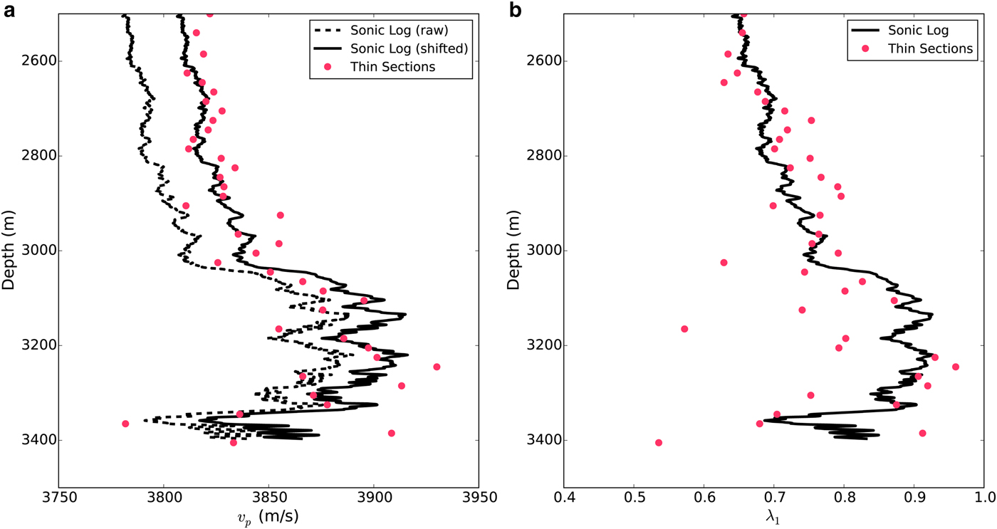 Fig. 13. Fabric parameter λ 1 inferred from P-wave velocities, compared with thin-section values. (a) Measured P-wave velocities compared to theoretical predictions (using (4) and (7)) from thin-section data at corresponding depths. Raw velocities (dashed line) were shifted (solid line) to minimize the first-order misfit with corresponding thin-section values. (b) Fabric eigenvalues λ 1 inferred from wave velocities, compared with those calculated from thin sections. Eigenvalues are inferred from P-wave velocities using the red curve in Figure 12b.