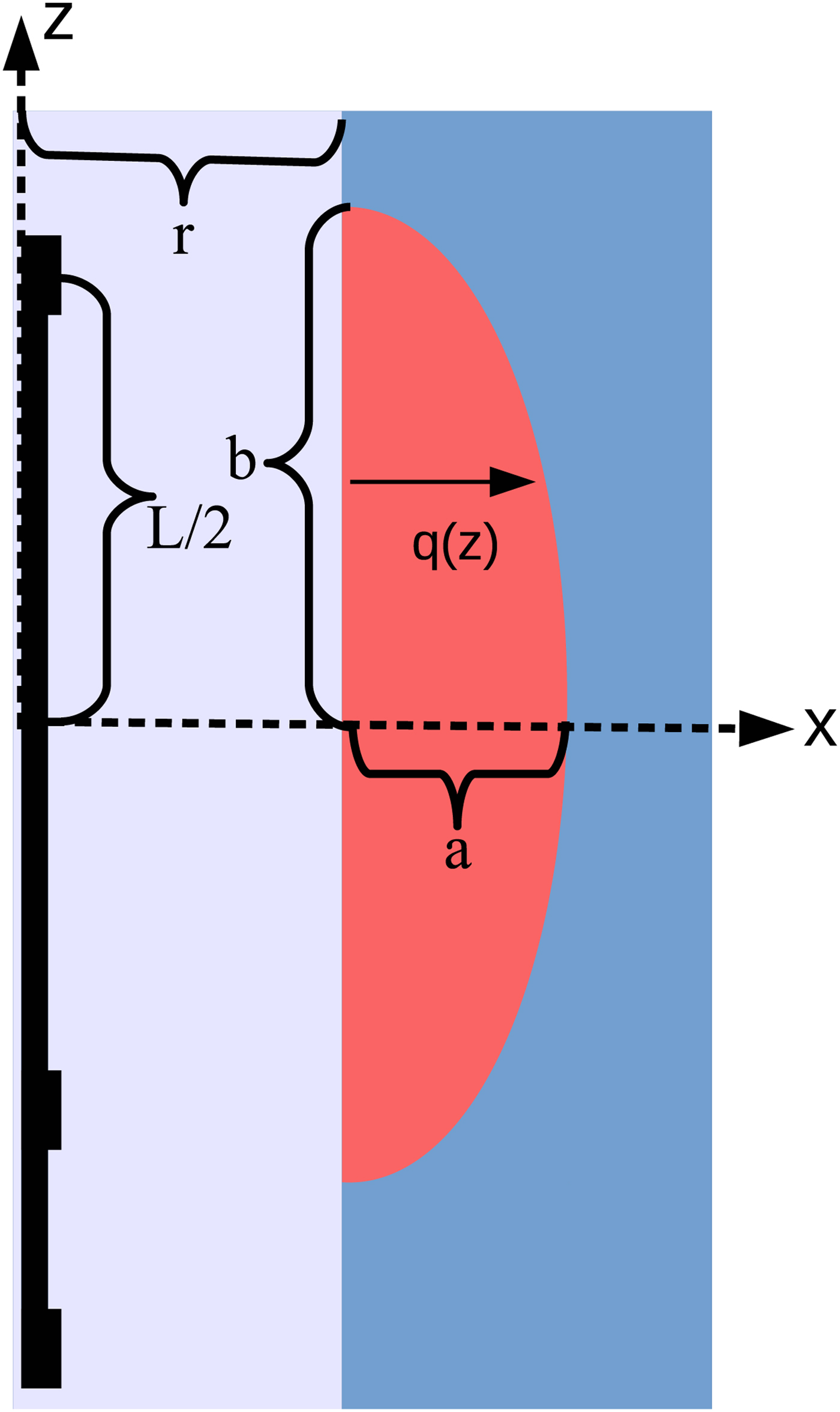 For our experiment, r ≃ 8 cm, L 2 ≃ 300 cm, and λ ≃ 16 cm – this indicates a Fresnel volume of ~2.5 m3, with an elliptical semi-minor axis (penetration depth) $a\,{\rm \simeq}\, 35{\kern 1pt} \,{\rm cm}$.