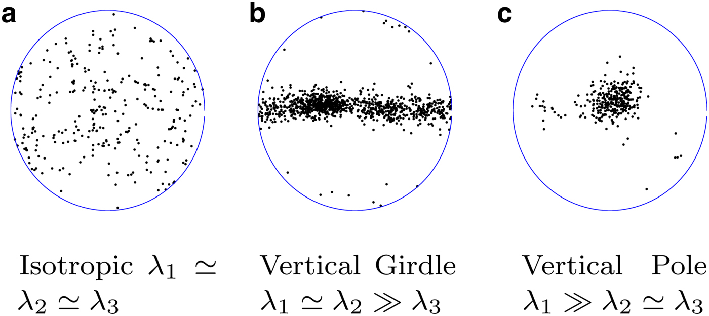 For an isotropic fabric, λ 1 = λ 2 = λ 3. For a pure pole (all c-axes aligned along one vector), λ 1 = 1; λ 2 = λ 3 = 0. For pure girdle fabrics (all c-axes distributed evenly throughout one plane): λ 1 = λ 2 = 0.5; λ 3 = 0.