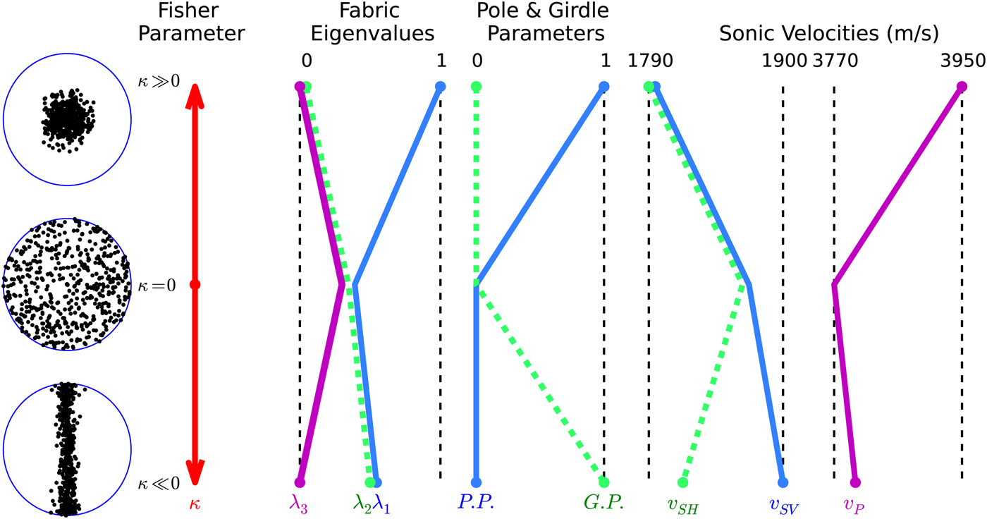 Fig. 2. A qualitative view of how several fabric parameters vary for a range of idealized fabrics. The left side shows three Fisherian distributions that correspond to positive, zero and negative values for the Fisher parameter κ. Minimum and maximum values for each fabric parameter are printed above their respective graphs. Each colored line shows the values that a parameter takes for a strong pole (top), isotropic (middle) and strong girdle (bottom) fabric, and is labeled with the parameter name in a corresponding color. P.P. and G.P are abbreviations for the pole parameter and girdle parameter.