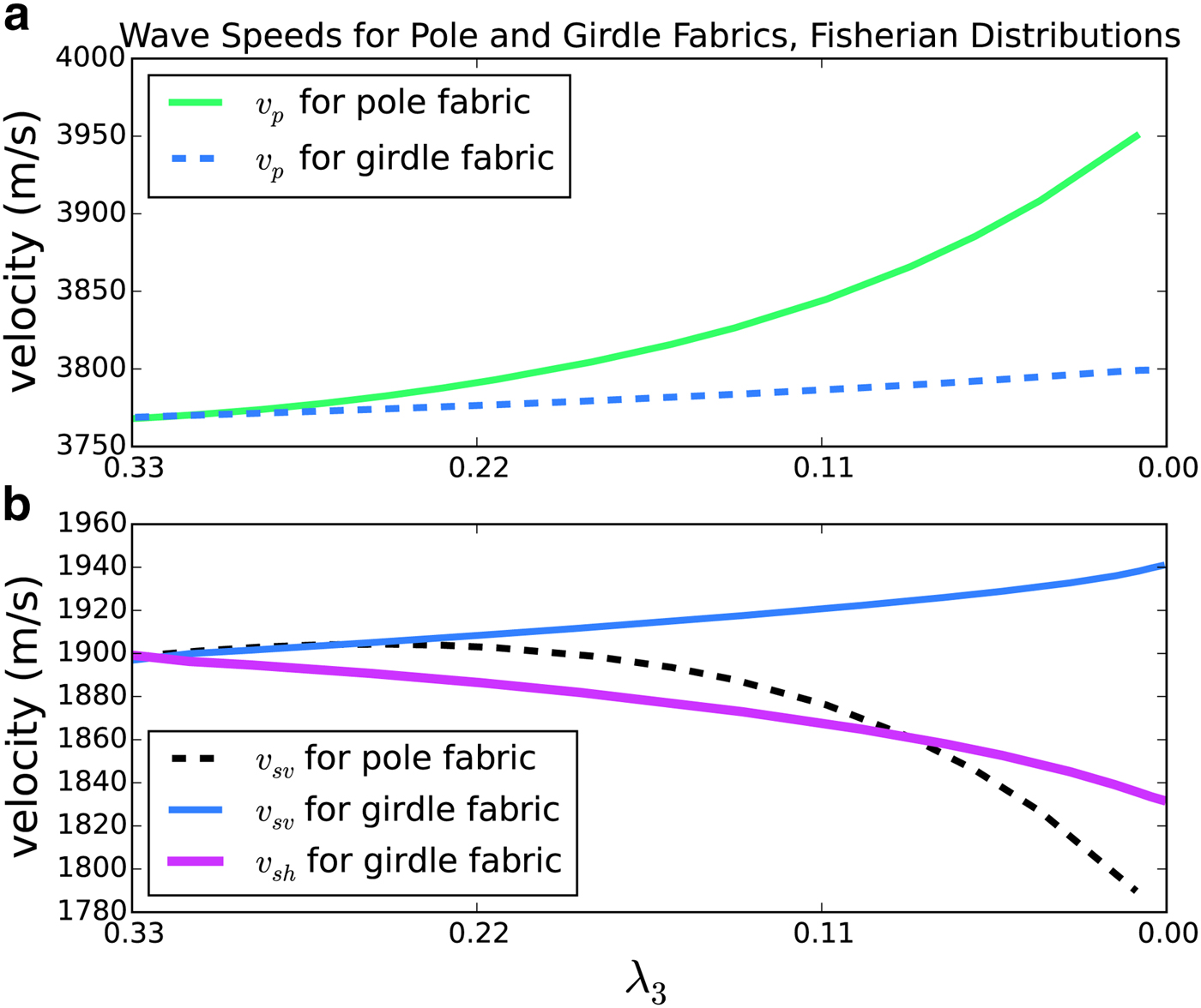 Velocities for the three head waves are shown in Fig. 3. All are calculated with (4), (5) and (7), and are based on Fisherian-distribution fabrics (8) with the parameter κ varied to produce various strengths of pole and girdle fabrics. Fabrics are described by the parameter λ 3, which varies from 1/3 to zero for both girdle and pole types.