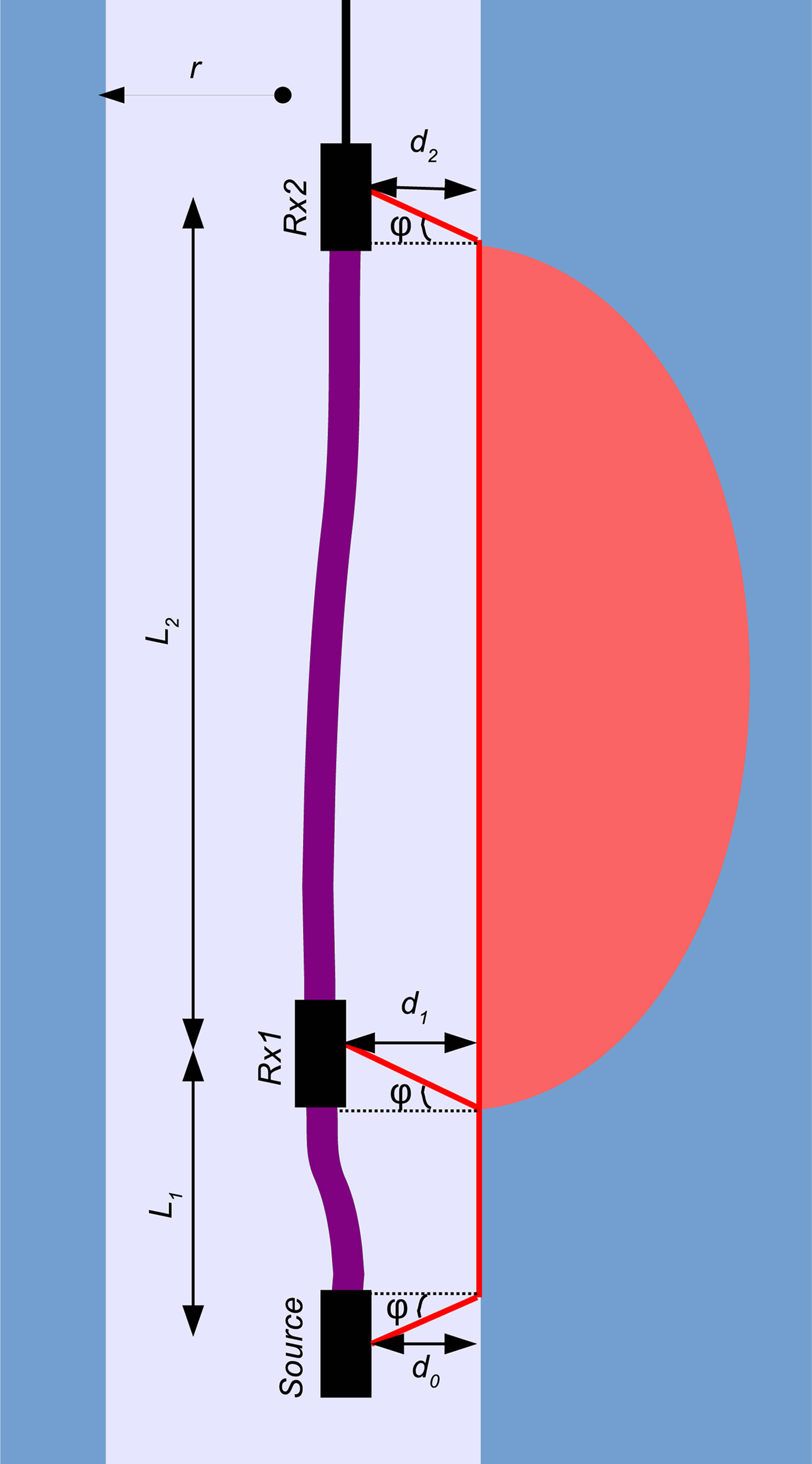 Fig. 5. Geometry of the sonic tool, borehole, surrounding ice and the propagation path for measured waves. The red, semi-elliptic region represents the Fresnel volume for ice that is sampled by sonic methods. Radius r is measured from the center of the borehole. Waves travel from the source, through the borehole fluid, through ice along the borehole wall and back through the fluid to each receiver. In the ideal case for a centralized tool, d 0 = d 1 = d 2 = r and the propagation geometry is azimuthally isotropic around the borehole.