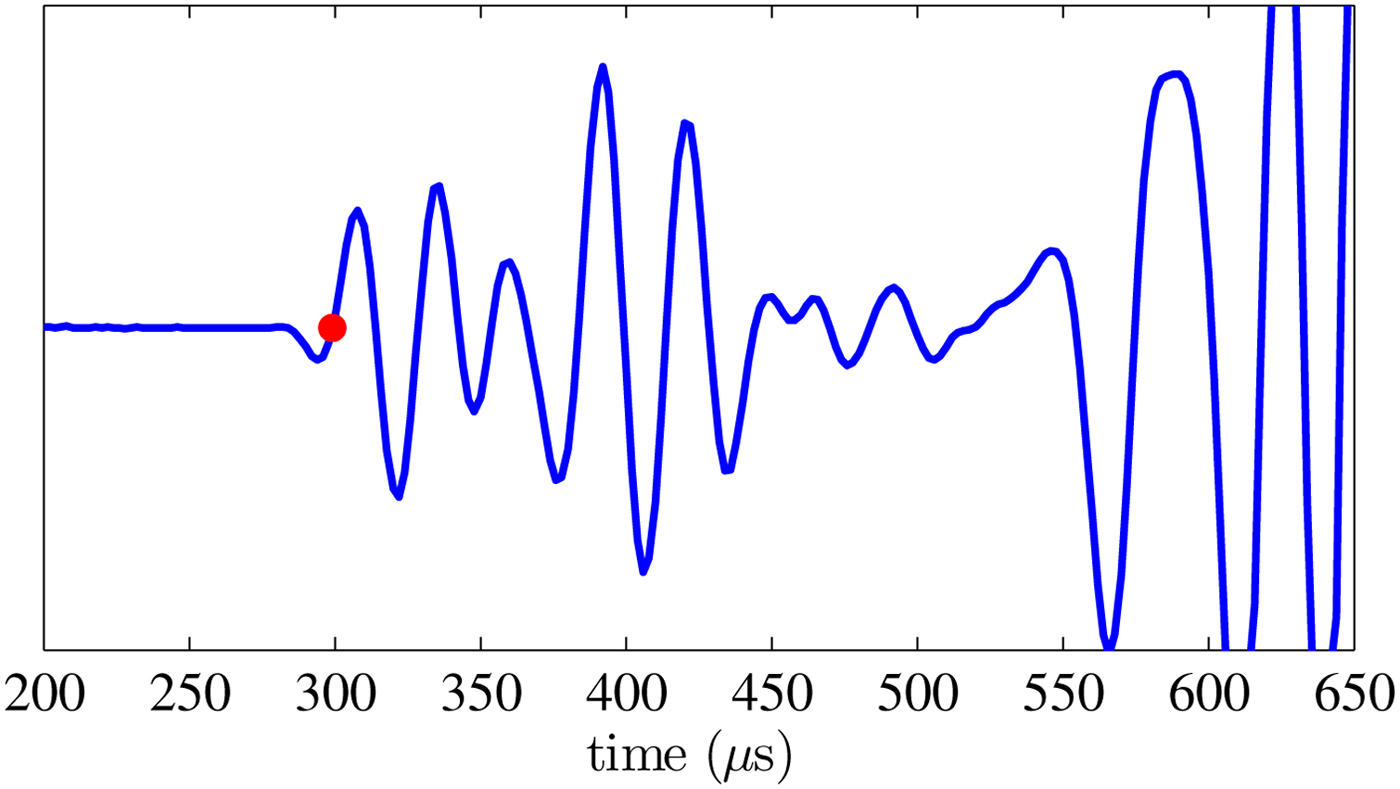 Fig. 6. Sample of a wave incident at Rx1. The arrival time (red dot) is chosen as the zero-crossing of the waveform subsequent to the initial dip in recorded pressure.