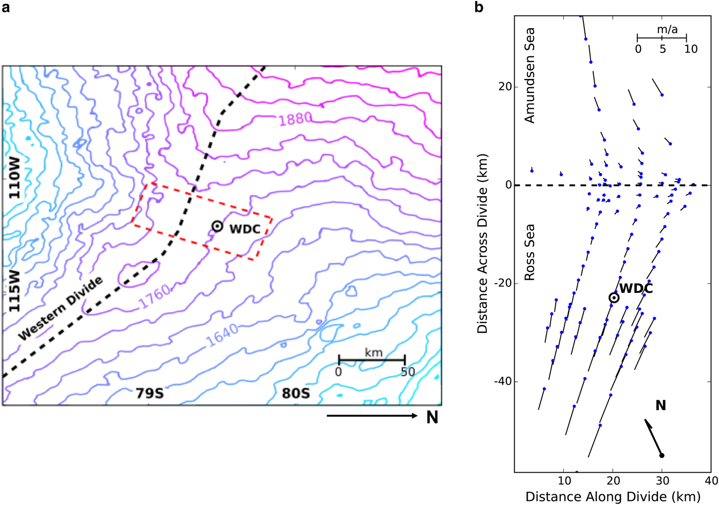 Fig. 7. (a) Topography of the WAIS Divide near the WAIS Divide Ice Core (WDC) site. Elevation data are from Liu and others (Reference Liu, Jezek, Li and Zhao2001). The GPS survey area for (b) is outlined in red. The contour interval is 40 m. (b) Surface velocities near the WAIS-Divide core site. Divide is at 0 km on vertical axis. Data from Conway and Rasmussen (Reference Conway and Rasmussen2009).