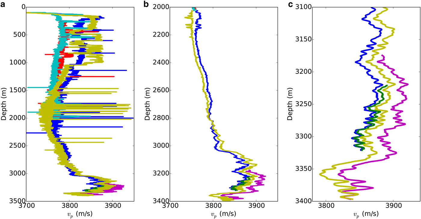 Figure 8b shows 3 m running averages for each log below 2000 m depth. We discard data from shallower depths where data quality was particularly poor. Each log was processed to remove artificial features – we removed major outliers, as well as spikes where the relative behavior of arrival times at Rx1 and Rx2 were not consistent (as described above). Some undesirable artifacts remain, including distinctly opposing velocity features between 2000 and 2200 m in the blue and yellow-green profiles. Presumably, some features in the borehole at these depths caused tool behavior with opposite results for two logs. This behavior underlies the need for precise tool centralization, as well as redundant logs to verify features.