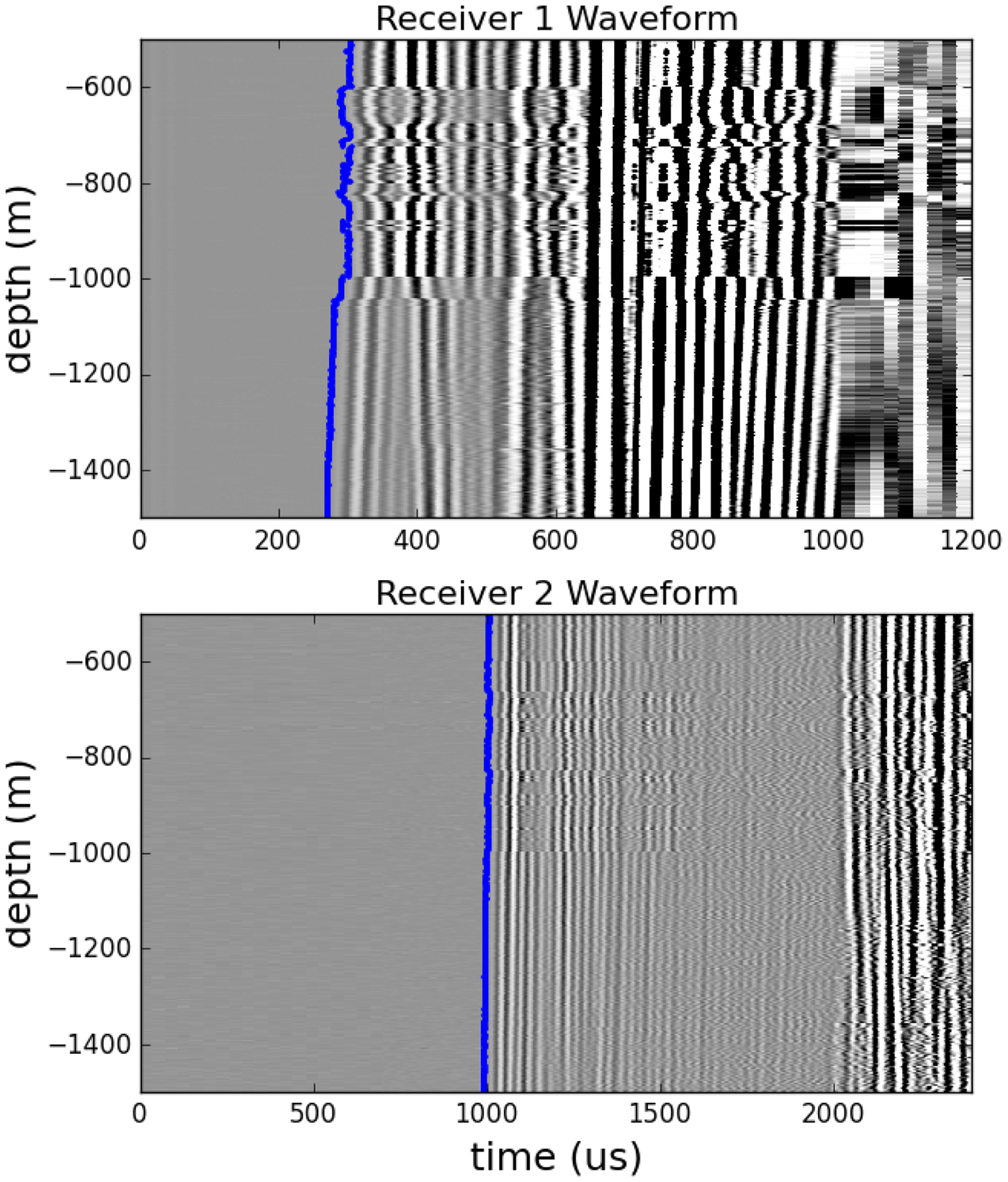 Fig. 9. Waveforms measured in the WAIS-Divide borehole. Shades correspond to pressure amplitudes. Calculated arrival times are marked in blue. This particular log is the same as for the dark-blue profile in Figure 8.