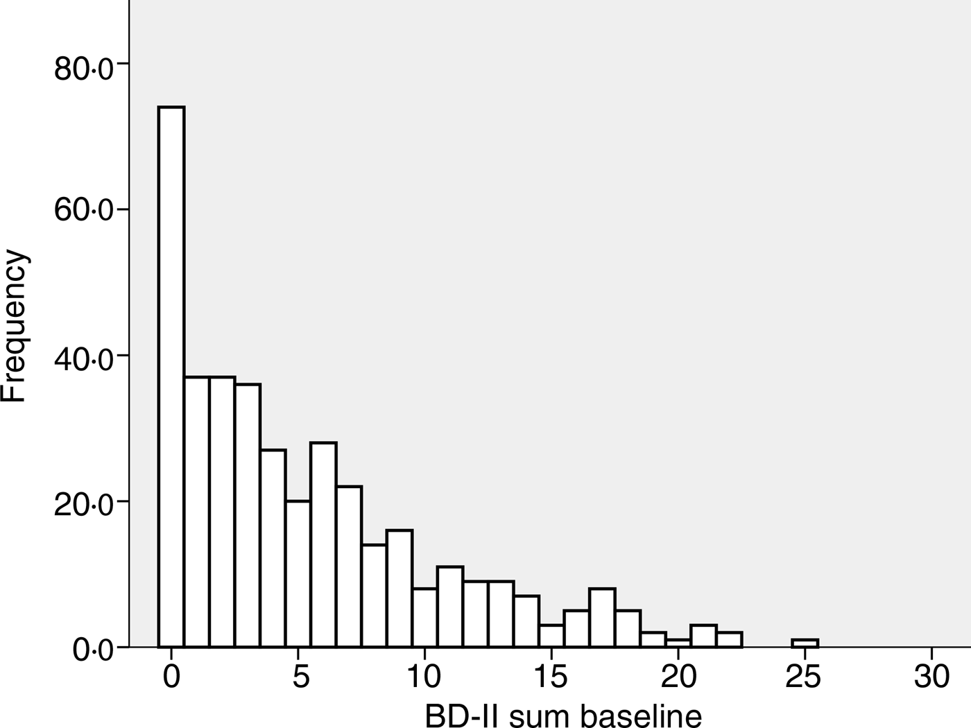 The BDI-II questionnaire consists of twenty-one items, each with four statements(Reference Steer, Clark and Beck22). The subjects are asked to choose the statement that best describes their condition during the last 2 weeks. The statements are rated from 0 (normal or least depressed mood) to 3 (most depressed mood). The BDI-II score was obtained by adding all the values together. A score 0–13 is considered as none or minimal depression, 14–19 as mild depression, 20–28 as moderate depression and 29–63 as severe depression(Reference Furukawa23). The BDI-II score varies considerably between populations, with mean scores of about 9 and medians of 6–7 in most non-clinical samples(Reference Whisman and Richardson24, Reference Wang and Gorenstein25).