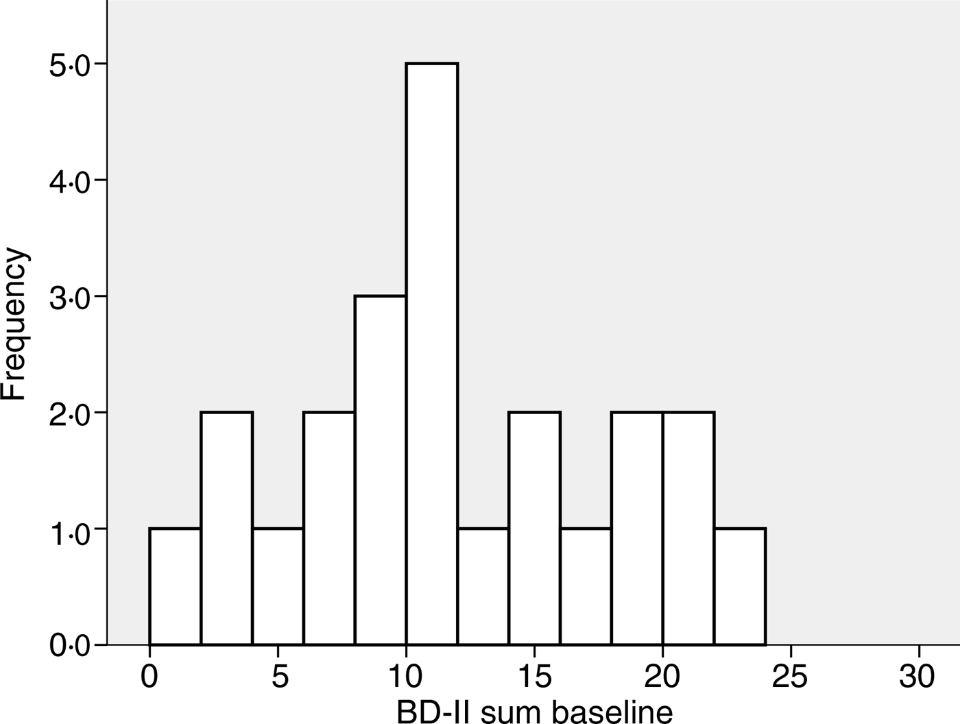 Fig. 2. Frequency of Beck Depression Inventory-II (BDI-II) scores at baseline in the twenty-three subjects using anti-depressant or mood-stabilising drugs.