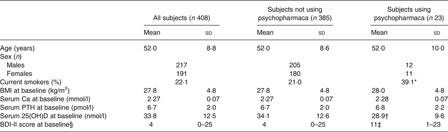 The baseline characteristics of the 408 subjects included in the analyses are shown in Table 1. There were no significant correlations between BDI-II score and age, BMI, serum Ca, PTH or 25(OH)D at baseline, nor were there significant differences between men and women, smokers and non-smokers regarding BDI-II (data not shown). Subjects using psychopharmaca (n 23) had significantly lower mean serum 25(OH)D levels than subjects not using psychopharmaca (n 385) (28·9 (sd 9·6) nmol/l v. 34·1 (sd 12·6) nmol/l; P < 0·05), and they also had significantly higher median BDI-II scores (11 (range 1–23) v. 4 (range 0–25); P < 0·001) (Table 1, Figs 1 and 2).