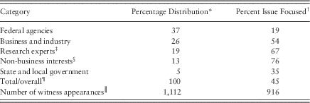Using witness lists of those individuals who appeared at the hearings, we categorised the witnesses into different groups of interests. This approach to identifying witnesses has been employed by policy process scholars in studying agenda change (see Baumgartner and Jones Reference Baumgartner and Jones1993), interest-group alignments in different policy areas (see Worsham Reference Worsham2006) and the involvement of different interests in shaping policy in particular policy areas (see Miller Reference Miller2004; Zafonte and Sabatier Reference Zafonte and Sabatier2004). Although we recognise that congressional hearings are orchestrated and generally biased towards involvement of interests with established relationships (see Leyden Reference Leyden1995), these biases are central to our research in getting at the types of expertise that are involved in addressing issues for which broader publics do not exist.