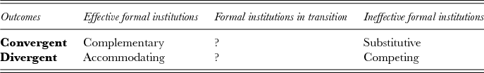 Accommodating combines effective formal institutions but divergent results. In this case, informal institutions create incentives for behavior that modifies the substantial effect of formal rules but does not directly violate them. They may be contradictory to the spirit of formal rules but not their writings. Even though this kind of informal institution is not necessarily efficiency enhancing, it is nevertheless able to strengthen the stability of a formal institution by cushioning demands for changes. The practice of blat utilized in the former Soviet Union provides an example of accommodating informal institutions. Because of strict rules, which prevented people meeting their basic needs, blat was used in order to meet these goals and also supported the existing regime because it cushioned demands for change (Ledeneva, Reference Ledeneva1998).