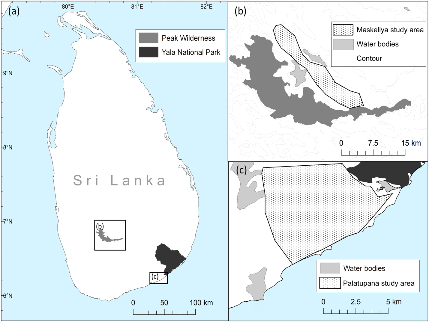 The second site, Maskeliya, is within the Central Highlands of Sri Lanka, a UNESCO World Heritage Site in the island's central wet zone. This region is dominated by large-scale tea plantations whose owners are increasingly permitting estate workers to rear cattle. It has a high human population density and is characterized by a landscape mosaic of tea cultivation, degraded secondary forest, less-disturbed forest patches and human settlements. Leopards inhabit forest patches at higher altitudes and use tea estates as movement corridors (Kittle et al., Reference Kittle, Watson and Fernando2012). This study site included eight tea estates located immediately north of Peak Wilderness Sanctuary (Fig. 1), the region's largest protected area. Most cattle owners are workers on the tea estates and rear cattle for secondary income. Cattle in this area are of a more productive breed and are not grazed in wildlife areas, but kept in enclosures. The Wilderness and Wildlife Conservation Trust has worked in the landscape for > 4 years and confirmed that at the time of the study, no depredation incidents had been reported in Maskeliya.