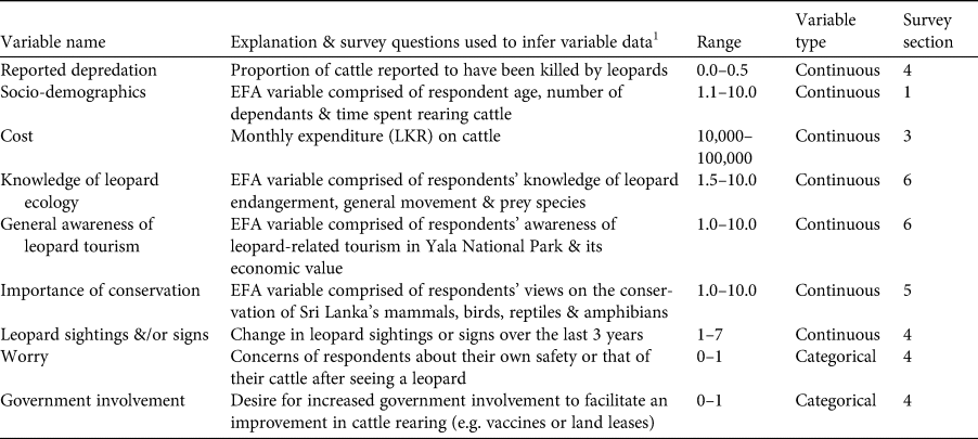 We analysed all data using R 3.5.1 (R Core Team, Reference Packer, Loveridge, Canney, Caro, Garnett and Pfeifer2018). We characterized attitudes towards leopards from the survey results using χ² statistics and Fisher's exact tests. We used exploratory factor analysis to group survey item responses and attitude statement responses into a manageable number of variables, and to avoid over-parametrizing our models. Exploratory factor analysis identifies collinear variables and extracts factors by grouping strongly associated variables together (DiStefano et al., Reference DiStefano, Zhu and Mîndrila2009). For example, the variables ‘age’, ‘number of dependants’, and ‘length of time rearing cattle’ were grouped into a single factor, described as ‘socio-demographics’, which captures the relative influence of each comprising variable, for use in subsequent modelling.