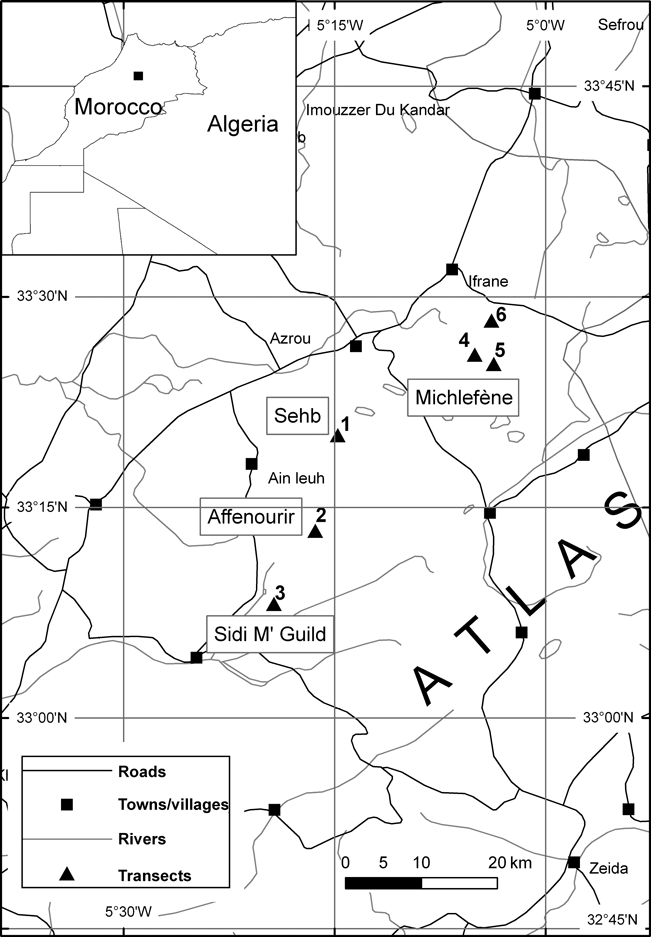 Fig. 1 The study area in the Atlas mountains of Morocco, indicating the locations of the six permanent transects (Table 2). The shaded rectangle on the inset indicates the location of the main map in Morocco.