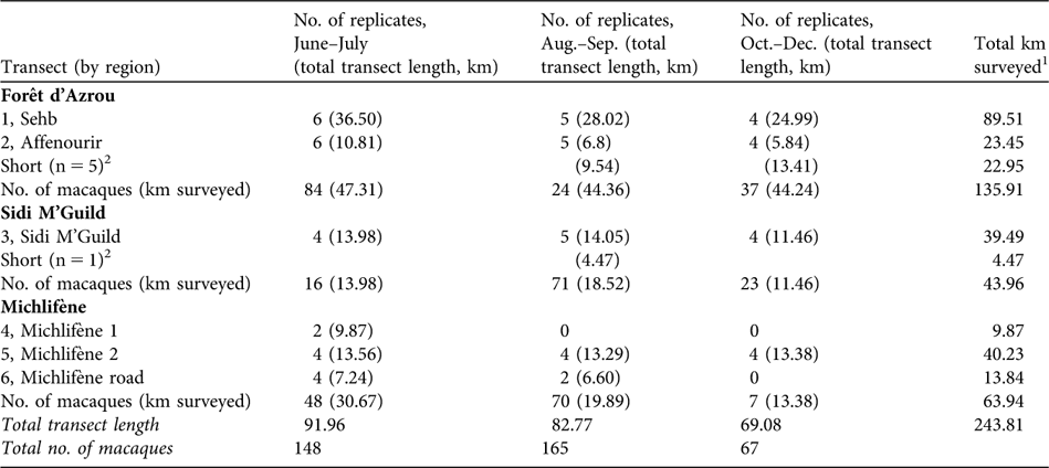 Table 2 Details of transects (Fig. 1) surveyed (both established transects surveyed more than once and short transects surveyed only once) and number of macaques observed, by region and by 2-month period.