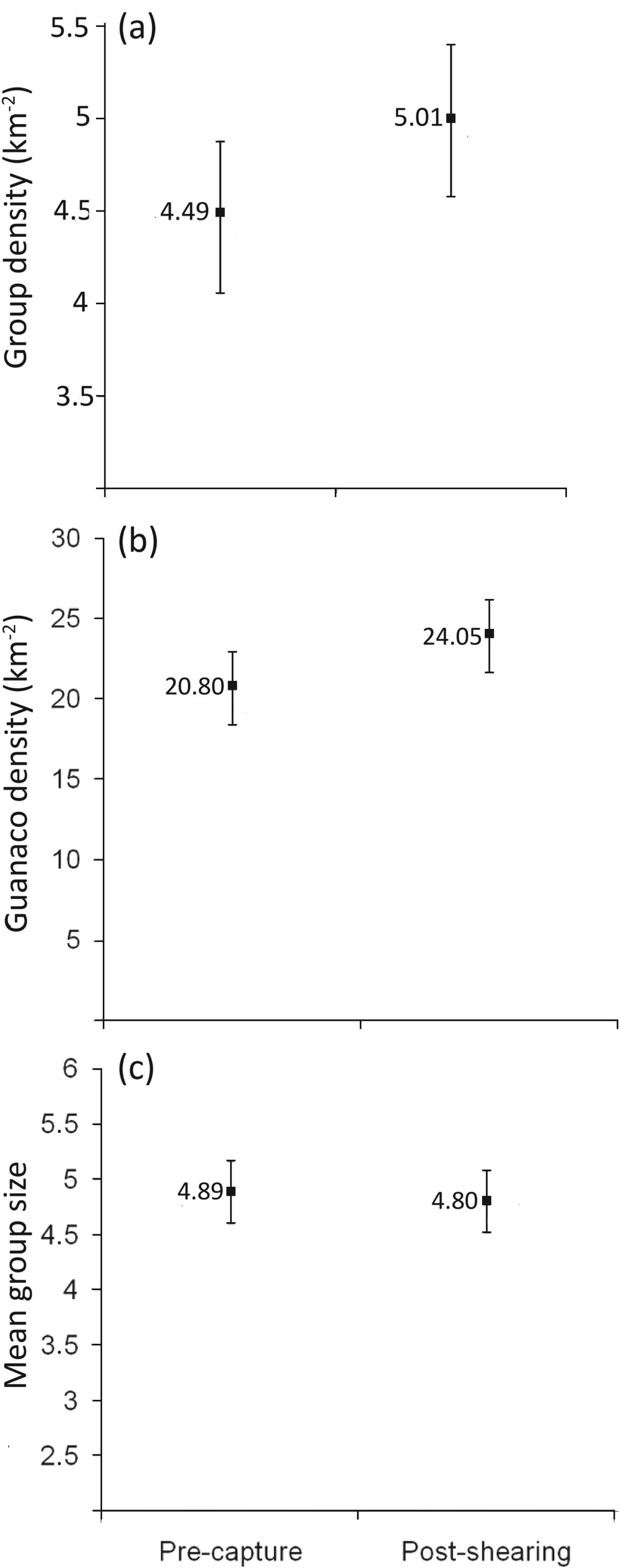 Fig. 2 Population parameters pre-capture and post-shearing for guanacos on the sheep ranch in Rio Negro province (Fig. 1): (a) group density, (b) population density, and (c) mean group size. None of the values are significantly different (post-hoc Tukey test, P < 0.05).