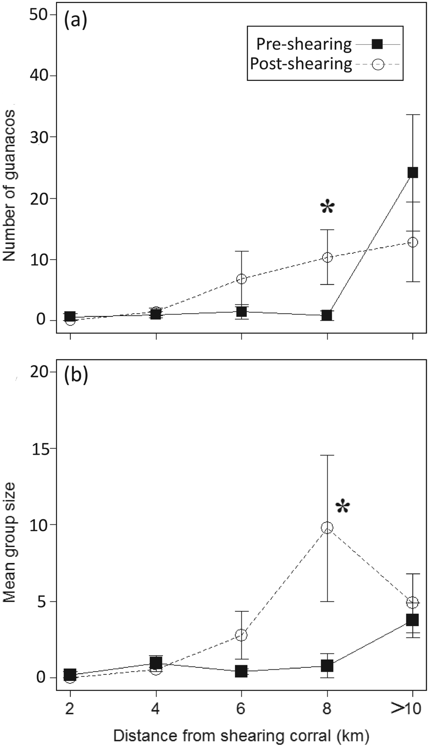 Fig. 4 Mean number of guanacos ± SE (a) and mean group size ± SE (b) with distance from the shearing corral before and after the shearing events on the sheep ranch during 2005.