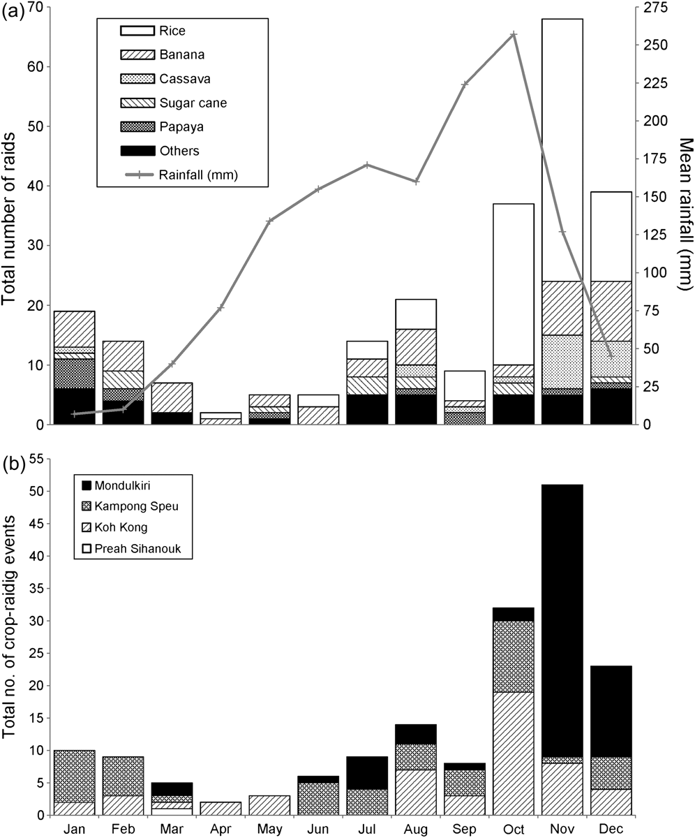 Fig. 5 (a) Total number of crops damaged per month, and mean rainfall per month (mm; for Phnom Penh, from Pearce & Smith, 1998) from January 2004 to December 2007 inclusive. Crops grouped as others are coconut, jackfruit, watermelon, mango, pineapple, maize, mixed crop (rice and maize), lemongrass, cashew, chilli, durian, garlic, mangosteen, peanut, pumpkin and taro. (b) Total number of crop-raiding events per month in the provinces of Monduikiri, Kampong Speu, Koh Kong and Phreah Sihanouk (Fig. 1) from January 2004 to December 2007 inclusive.