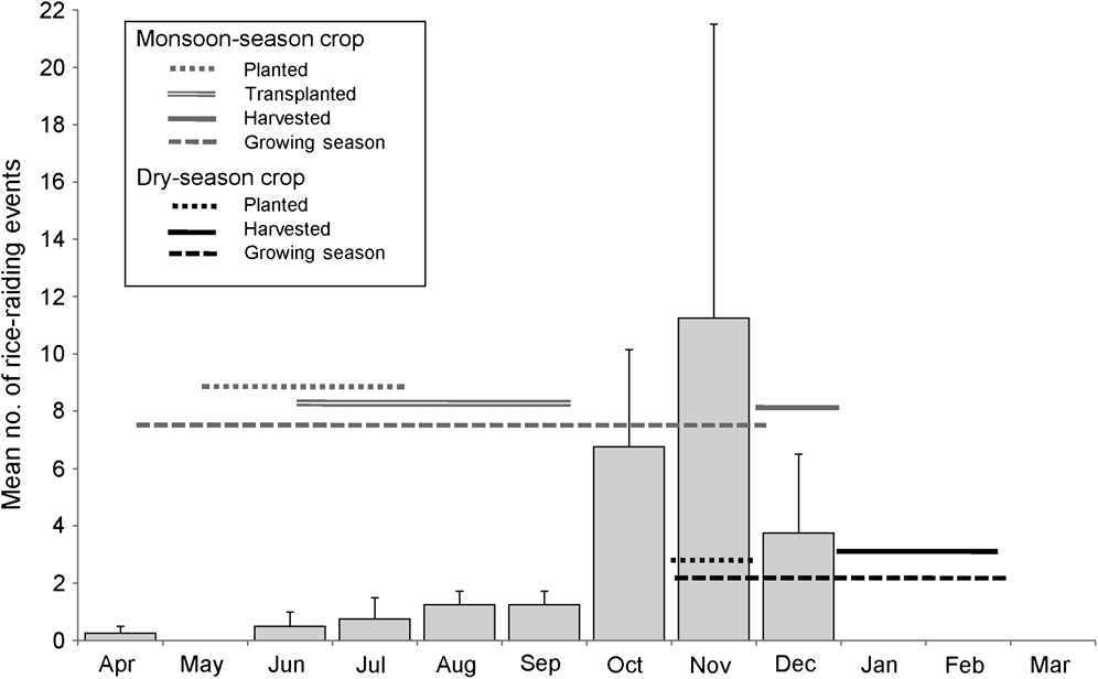 Fig. 6 Rice growth seasons (from Ross, Reference Ross1987) in Cambodia and mean number of rice-raiding events per month (with SE bars) from January 2004 to December 2007 inclusive.