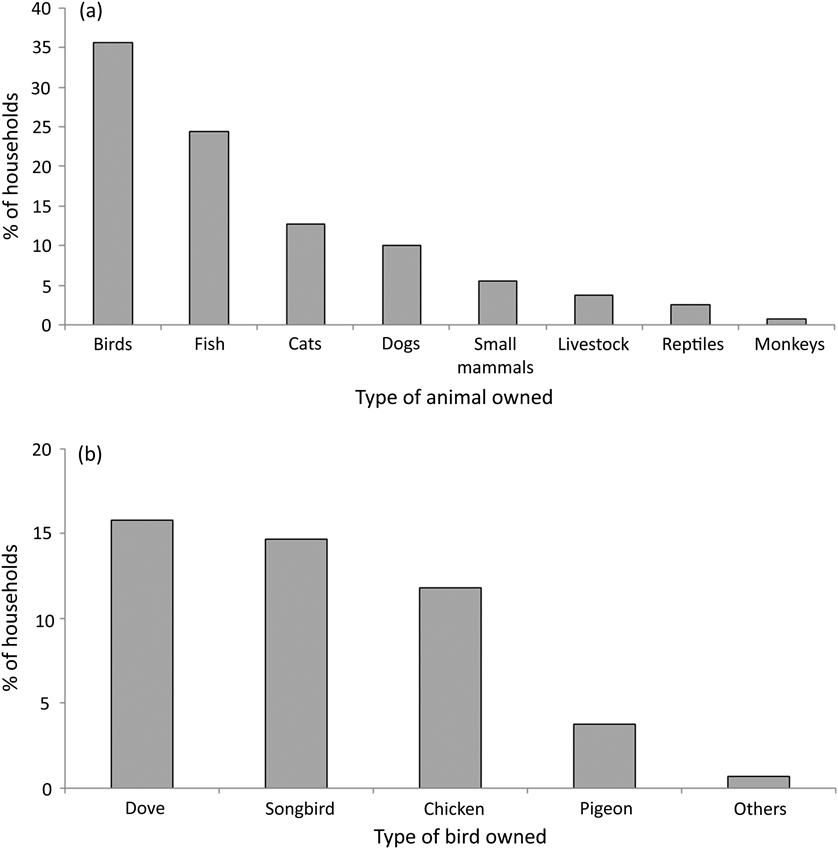 Fig. 1 Percentages of households in six cities on Java and Bali keeping (a) different categories of pet and (b) different categories of bird.