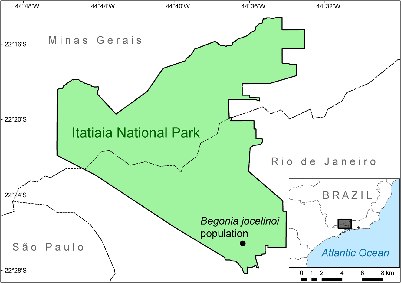 Most Brazilian species of Begonia are endemic to the country, mainly to the highly diverse and threatened Atlantic Forest (Jacques & Gregório, Reference Jacques and Gregório2020). As a result of historical loss and fragmentation of natural habitats, the Atlantic Forest is one of the so-called hottest global hotspots (Laurance, Reference Laurance2009; Rezende et al., Reference Rezende, Scarano, Assad, Joly, Metzger, Strassburg and Tabarelli2018), and protected areas are critical for the conservation of the remaining fragments of this forest. The first protected area in Brazil, Itatiaia National Park, was founded in 1937 in an important centre of endemism in the Atlantic Forest, the Mantiqueira Mountain Range (Fiaschi & Pirani, Reference Fiaschi and Pirani2009). The Park is an IUCN (1994) category II protected area, which allows public visitation.