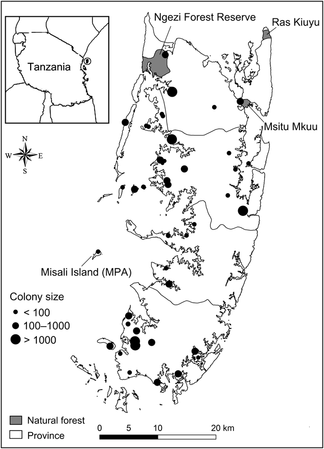 Fig. 1 The distribution of all occupied Pemba flying fox Pteropus voeltzkowi roosts on Pemba Island, Tanzania. Circle on inset indicates the position of Pemba and neighbouring islands within the Zanzibar archipelago off the east coast of Tanzania.