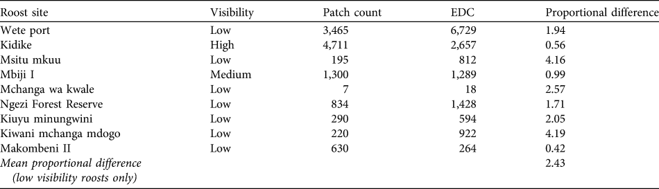 Table 2 Colony counts at nine P. voeltzkowi roost sites, using patch count and evening dispersal count (EDC) methodologies on the same day. Low visibility sites were used to calculate the mean proportional difference.