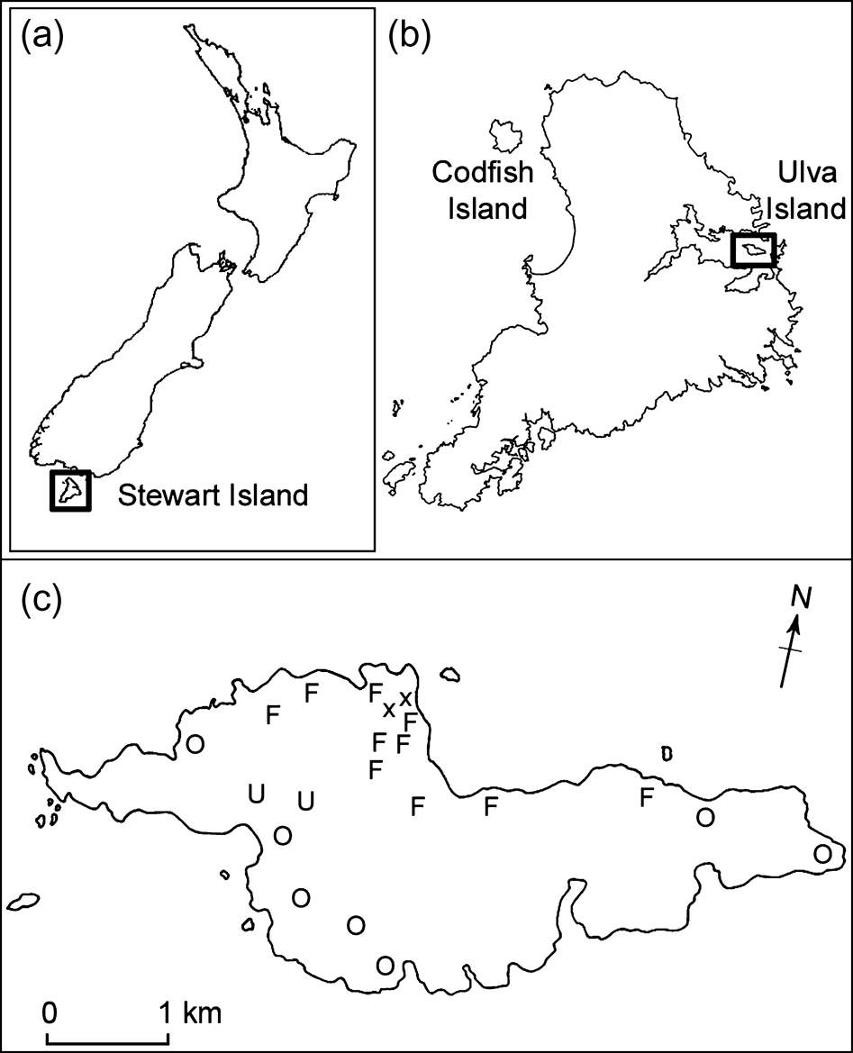 Codfish Island, a 1,396 ha island sanctuary managed by the Department of Conservation, is located c. 3 km north-west of Stewart Island (Fig. 1). Pacific rats Rattus exulans were eradicated from Codfish Island by 2000 (McClelland, Reference McClelland, Veitch and Clout2001). Ulva Island is a 267 ha predator free open sanctuary located 1.5 km inside Paterson Inlet of Stewart Island (Fig. 1). Ulva has a typical southern New Zealand mixed podocarp forest similar to that on Codfish Island. Ulva is the nearest predator-free island to the source of Codfish founders. Norway rats R. norvegicus were eradicated from Ulva by 1995.