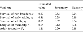 Table 2 Sensitivity and elasticity analyses of vital rates on population growth rate for a three-stage matrix model for rifleman on Ulva Island, New Zealand.