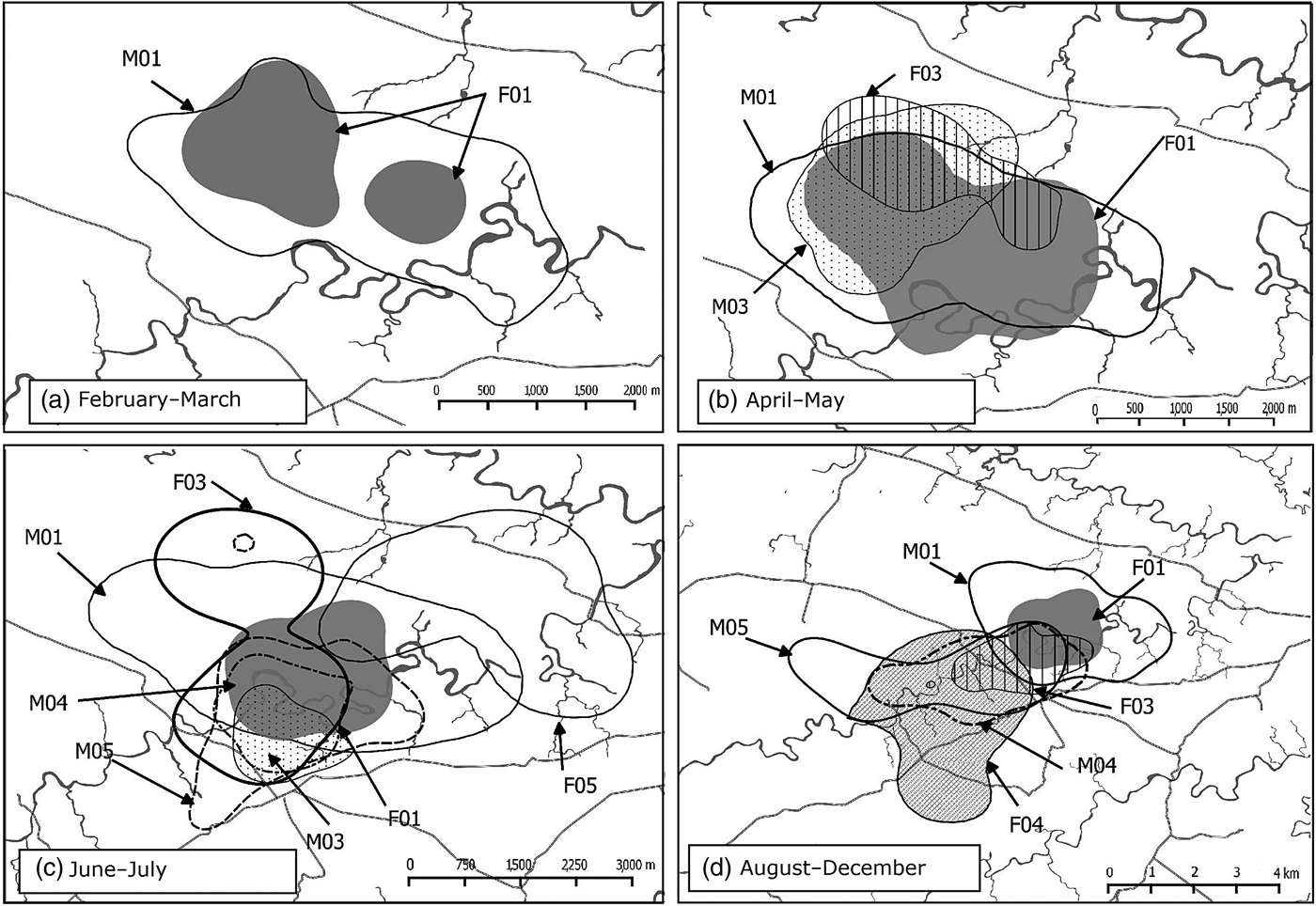 F01|M01 was the only dyad analysed for all four periods. They displayed high overlap (> 0.4) of their home ranges (Fig. 5; Table 4). There was also high overlap between the home range of M04 and those of F03, F04 and F05, particularly during August–December (Fig. 5; Table 4), when M04 was the only male whose home range overlapped with those of three females. M01 overlapped with two females and M05 overlapped only with F05.