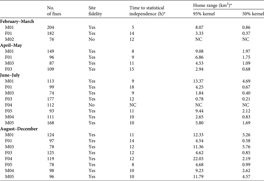 Before estimating lynx home ranges, site fidelity and time to statistical independence were calculated for each individual (Laver & Kelly, Reference Laver and Kelly2008; Supplementary Fig. S1). Absence of site fidelity and presence of exploratory behaviour were expected, particularly during the first weeks; later, the presence of conspecifics would contribute to the establishment of stable home ranges. Home range analyses were not performed in the absence of site fidelity to avoid biased home range estimates.