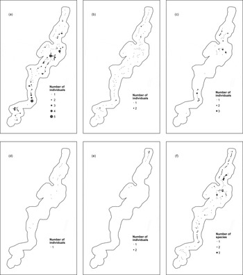 Fig. 2 Distribution of (a) red-crested turaco Tauraco erythrolophus, (b) Gabela akalat Sheppardia gabela, (c) Gabela bushshrike Laniarius amboimensis, (d) Monteiro's bushshrike Malaconotus monteiri, and (e) Pulitzer's longbill Macrosphenus pulitzeri, and number of individuals registered at each sample point. The distribution of all threatened endemic species (except the red-crested turaco) is shown in (f).
