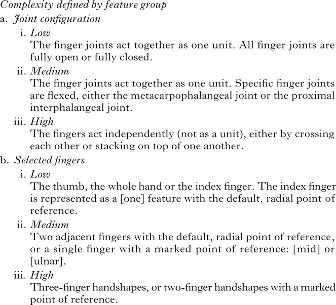 Joint configuration and selected finger features can be assigned complexity scores based on their structural complexity (Brentari et al. Reference Brentari, Coppola, Mazzoni and Goldin-Meadow2012, Aristodemo Reference Aristodemo2014), frequency (Hara Reference Hara2003, Eccarius & Brentari Reference Eccarius and Brentari2007, Caselli & Pyers Reference Caselli and Pyers2017) and age of acquisition in first language acquisition (Boyes Braem Reference Boyes Braem, Volterra and Erting1990, Marentette & Mayberry Reference Marentette, Mayberry, Chamberlain, Morford and Mayberry2000, Morgan et al. Reference Morgan, Barrett-Jones and Stoneham2007). For example, fully open