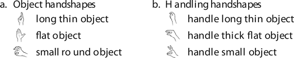 Joint configuration and selected finger features not only create phonemic contrasts, as in Fig. 1; these two groups of features are also associated with two iconic, meaningful handshape classes in the morphological system of many sign languages: object handshapes, which represent the shape of objects, and handling handshapes, which represent how objects are manipulated or used (Supalla Reference Supalla1982, Emmorey Reference Emmorey2003). Object and handling handshapes also show a morphosyntactic opposition (Zwitserlood Reference Zwitserlood2003, Benedicto & Brentari Reference Benedicto and Brentari2004). Object handshapes are associated with no-agent clauses (typically intransitive), and handling handshapes are associated with agentive clauses (typically transitives). These distributional patterns of object and handling handshape classes are found in both NSL (Goldin-Meadow et al. Reference Goldin-Meadow, Brentari, Coppola, Horton and Senghas2015) and CTSL (Ergin & Brentari Reference Ergin, Brentari, LaMendola and Scott2017). A handshape class distinction for meaning does not, however, speak to how the two handshape classes are expressed phonologically.