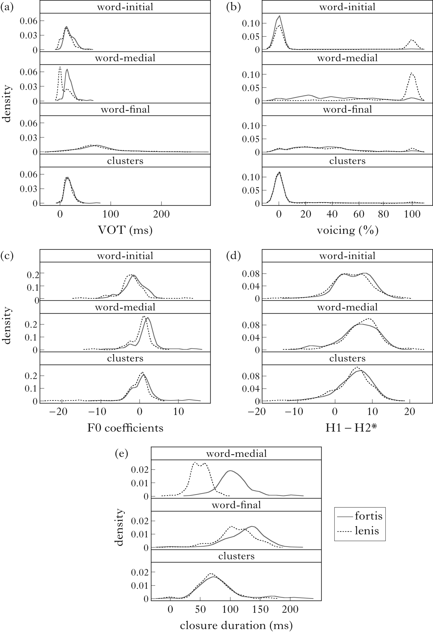 Figure 1 Distributions of (a) VOT, (b) voicing, (c) F0 coefficients, (d) H1–H2* and (e) closure duration by context and fortis vs. lenis.