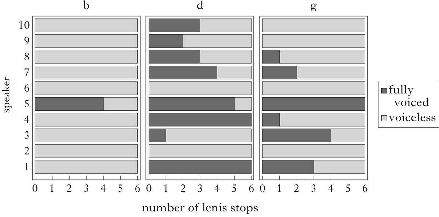 A closer look at the data reveals that word-initial lenis consonants exhibit a high degree of interspeaker variability, as illustrated in Fig. 2. While all but one speaker realised word-initial labials as voiceless, behaviour between speakers varied for alveolars and velars. With respect to alveolars, four of the ten speakers produced more than half of the six lenis items with some prevoicing, four produced fewer than half or none of the items as voiced and two produced exactly half of the items with prevoicing. Velar lenis were produced with prevoicing more than half of the times by two speakers, exactly half by one speaker and less than half of the time or never by the remaining speakers.