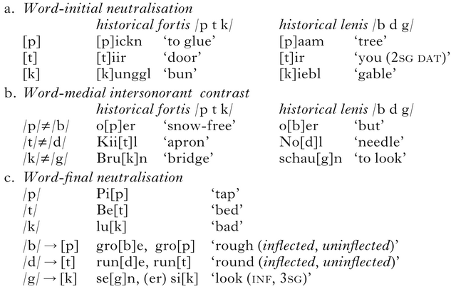 Whether the pattern is contact-induced or not, the variability of word-initial neutralisation does point to Tyrolean as a dialect of transition between systems in the south, which preserve word-initial contrast, and systems in the north, which neutralise laryngeal contrasts completely.