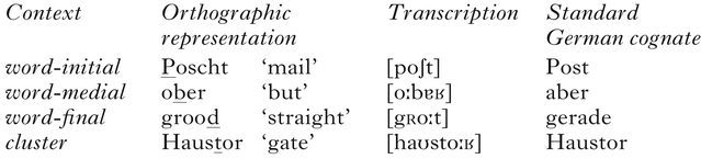 In Modern Standard German, as in most varieties of German, two series of stops are found, distinguished by a single laryngeal feature. Traditionally, dialectologists call these two series fortis (corresponding to orthographic <p t k>) and lenis (corresponding to <b d g>). Following Beckman et al. (Reference Beckman, Jessen and Ringen2013), we will use the terms fortis and lenis throughout this paper, without implying that they have any phonetic or phonological content. The terminology is useful for referring to distinct natural classes of stops whose exact specification has yet to be determined.
