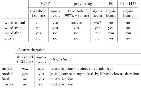 In sum, the analysis of the main acoustic parameters (VOT, prevoicing, F0, H1–H2* and closure duration), indicates neutralisation of contrast in final position, a result in line with the process of final devoicing observed in most German dialects.