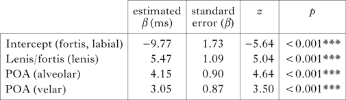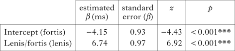 The analysis of prevoicing in word-initial context is a mixed-effects logistic regression (we used the glmer function from the lme4 package) – a technique used to analyse categorical binary variables – with Lenis/fortis and POA as main fixed effects and Subject and Item as random intercepts. The reference value for the dependent variable is ‘fully voiced’. The effects of the predictors should therefore be interpreted as affecting the probability of producing a fully voiced stop. The (generalised) linear mixed model is fit by maximum likelihood, using Laplace approximation.