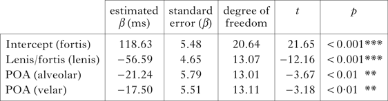 (a) VOT. The model in Table VI includes Lenis/fortis and Place of articulation (POA) as main fixed effects, and Subject and Item as random intercepts. The table gives the estimated value for each fixed-effect coefficient, along with its standard error, Restricted Maximum Likelihood (REML) t-test value and the corresponding significance value (using Satterthwaite approximations to degrees of freedom).