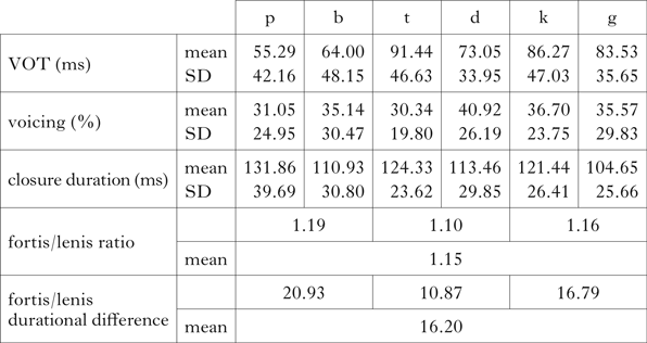 Table II Mean acoustic values of fortis and lenis stops in word-initial context.
